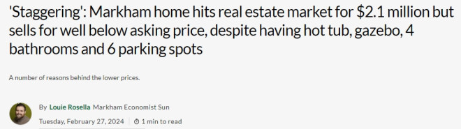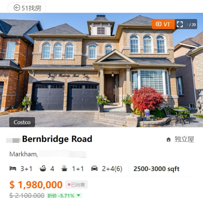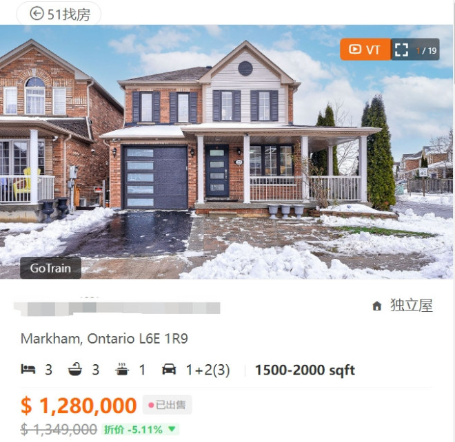 地产网站的数据显示,万锦市的一套双车库独立屋挂牌上市后五天后,以低于要价12万元的“意外”价格售出。